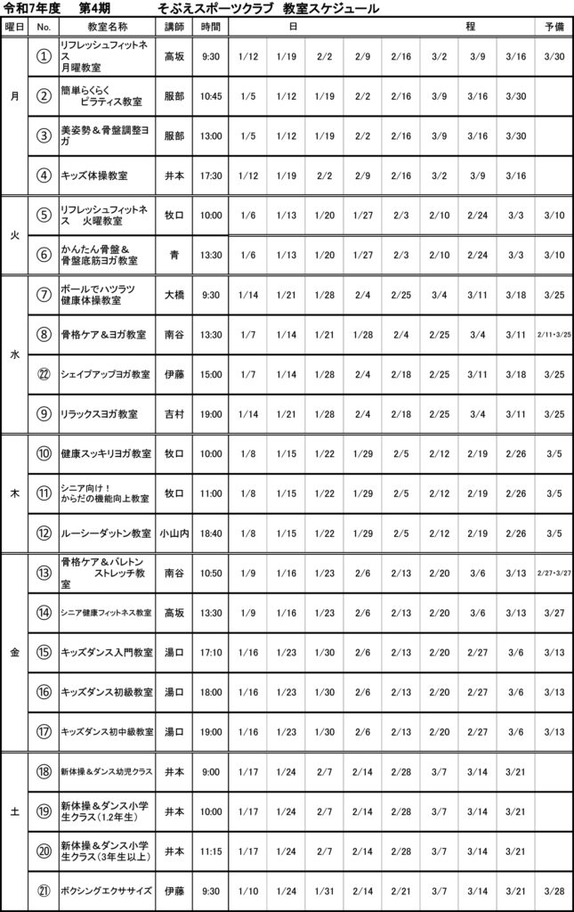 令和7年度第4期そぶえスポーツクラブ教室一覧